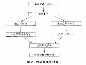 本工程主要采用電暈放電形式處理廢氣,在外加電場的作用下,電暈或者介質(zhì)放電產(chǎn)生了大量攜能電子轟擊污染物分子,使其電離、解離和激發(fā),然后便引發(fā)了一系列復(fù)雜的物理、化學(xué)反應(yīng),使復(fù)雜大分子污染物轉(zhuǎn)變?yōu)楹唵涡》肿影踩镔|(zhì),或使有毒有害物質(zhì)轉(zhuǎn)變成無毒無害或低毒低害的物質(zhì),從而使污染物得以降解去除。